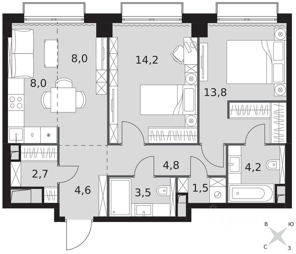 - Мастер-зона с санузлом. Уют и комфорт в одном пространстве.