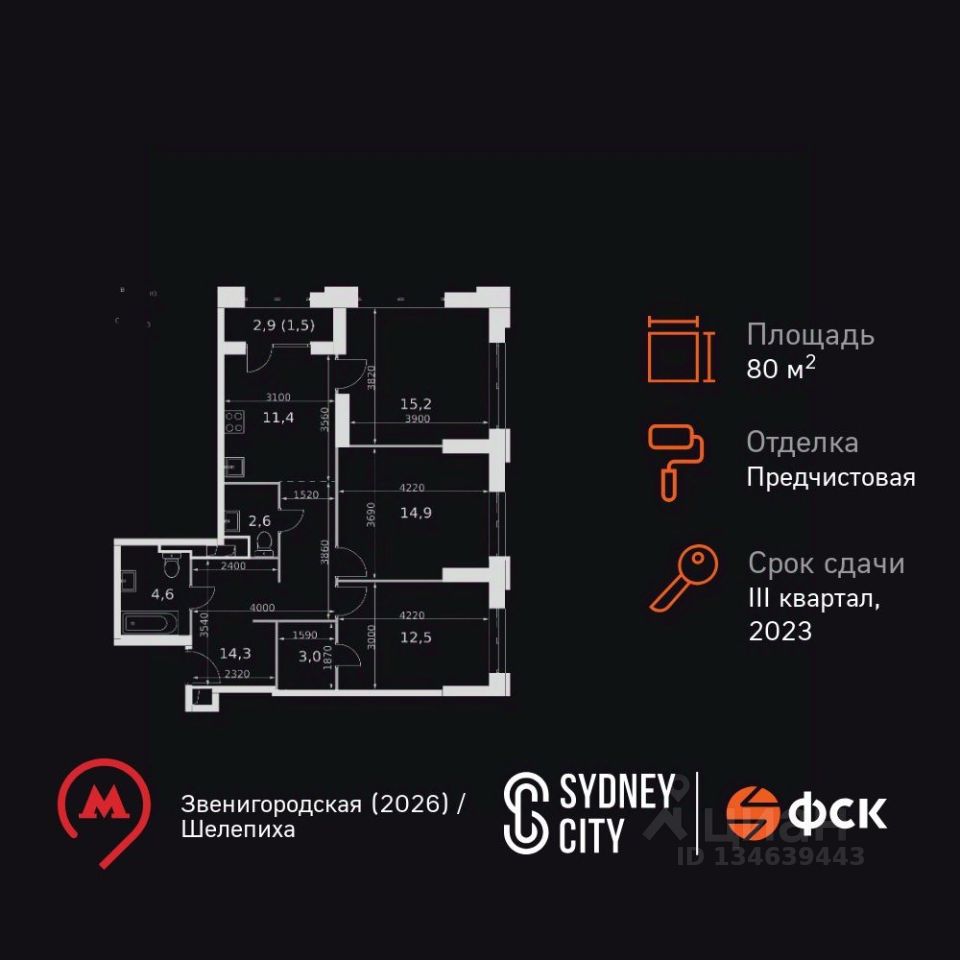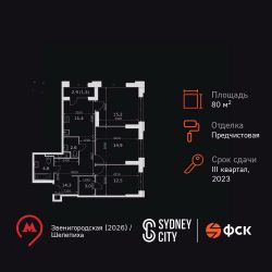 Продаётся 3-к квартира номер 74 общей площадью 80 кв.м. на 8-м этаже 43 этажного здания. Отделка Whitebox. Цена с учётом скидки.