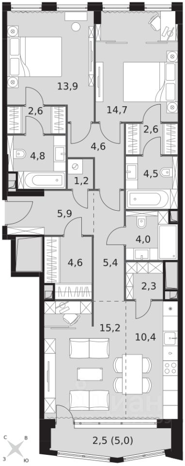 - Мастер-зона с санузлом и гардеробной. Всё для вашего комфорта и удобства, включая личный санузел и гардероб.