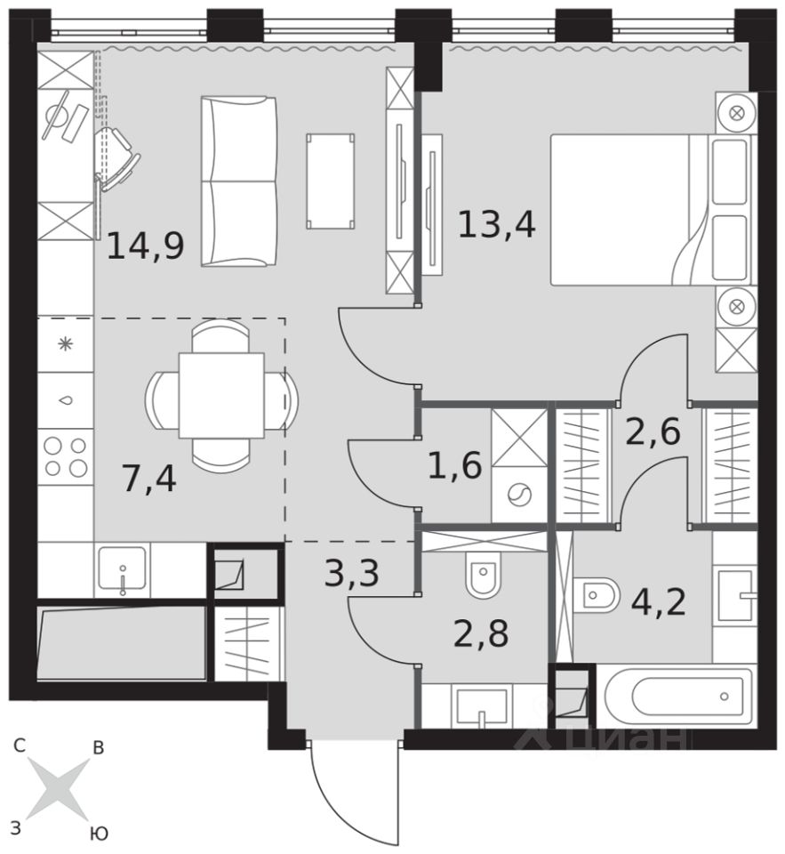 - Мастер-зона с санузлом и гардеробной. Всё для вашего комфорта и удобства, включая личный санузел и гардероб.