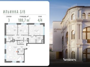 "Ильинка 3/8" - cамая близкая к Кремлю и Красной площади коллекция клубных особняков. Дом расположен на месте Тёплых торговых рядов: 160 м до Красной площади, 300 м до Кремля, 500 м до Администрации Президента. Ранее в этой исторической локации проживали представители царских сословий. По соседству находятся одна из старейших в городе Богоявленская церковь и Биржевая площадь. Расположение дарит жителям комфорт и разнообразие: пересечение Ильинки и тихого Богоявленского переулка с минимальным трафиком автомобилей, близость Никольской улицы с её насыщенной инфраструктурой - от топовых бутиков до ресторанов Michelin. "Ильинка 3/8" - это 7 эксклюзивных и роскошных особняков: 3 деликатно реконструированных исторических и 4 новых. В них представлена инфраструктура только для своих: красивый двор-сад с парадной и торжественной входной группой; лобби-бар для встреч, где можно подождать домочадцев, выпить чашечку кофе или взять её с собой; бесплатный фитнес по стандарту инфраструктуры для здорового образа жизни FIT LAB, общественная гостиная по стандарту FRIENDS LAB для знакомства и совместного времяпрепровождения соседей в доме. В клубных особняках представлены самые полные и лучшие в своём классе системы комфорта. О жителях и доме заботится Служба комфорта Smineх, которая предлагает сервис уровня 5-звёздочных отелей и сохраняет изначальный облик и концепцию дома. Девелопер проекта - Sminex, который специализируется на создании комфортной и престижной среды для жизни и работы.