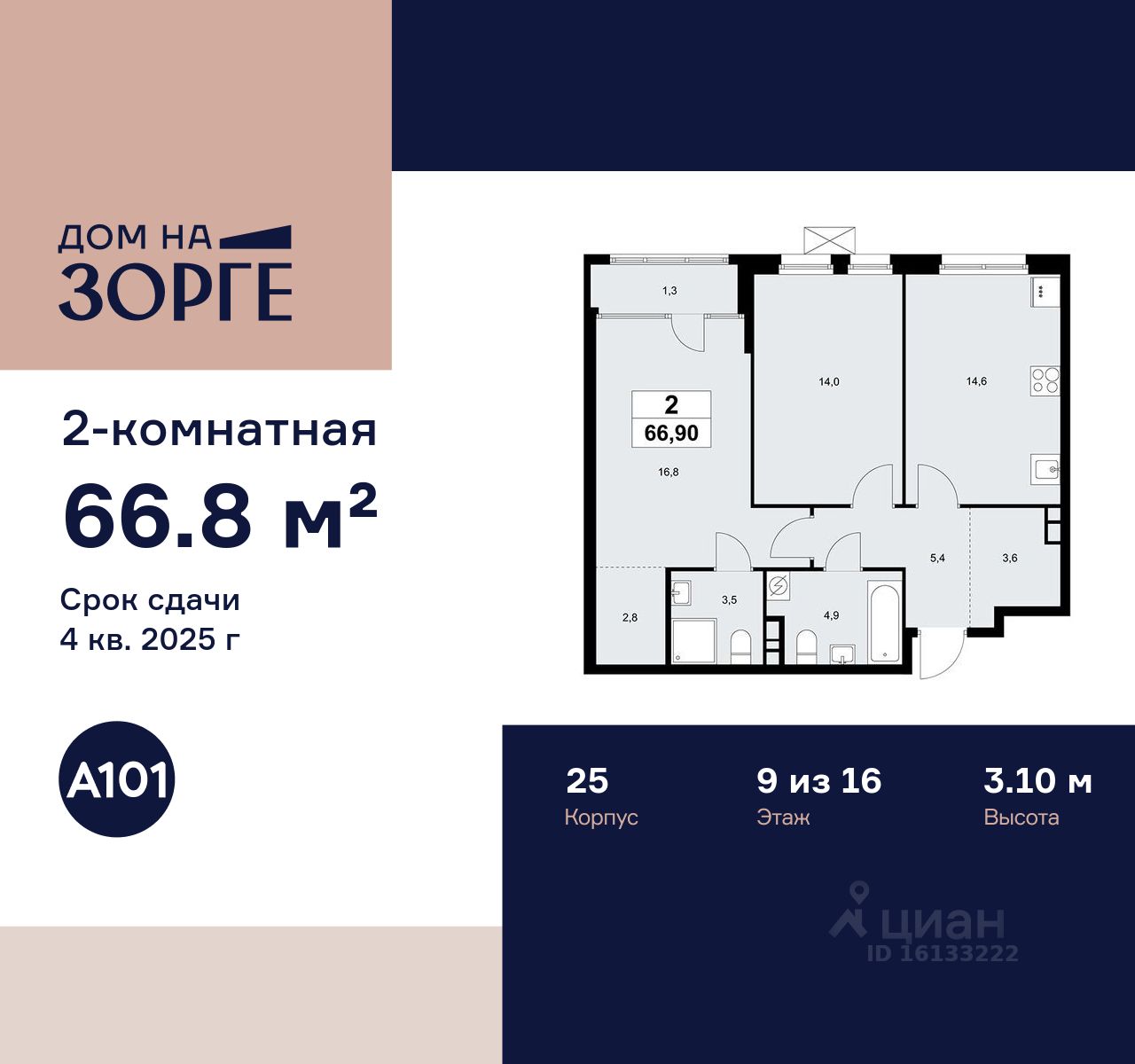 Продается двухкомнатная квартира 250 в новостройке ЖК "Дом на Зорге" по адресу Москва, САО, Сокол, улица Зорге, 25с2, Москва, 125252. Общая площадь квартиры - 66.80 кв. м., этаж 9 из 16, секция 2. Тип проекта, по которому построен дом - монолит, компания-застройщик - ООО "А101". Стоимость квартиры - 36226660 Р. Срок сдачи - 4 квартал 2025.