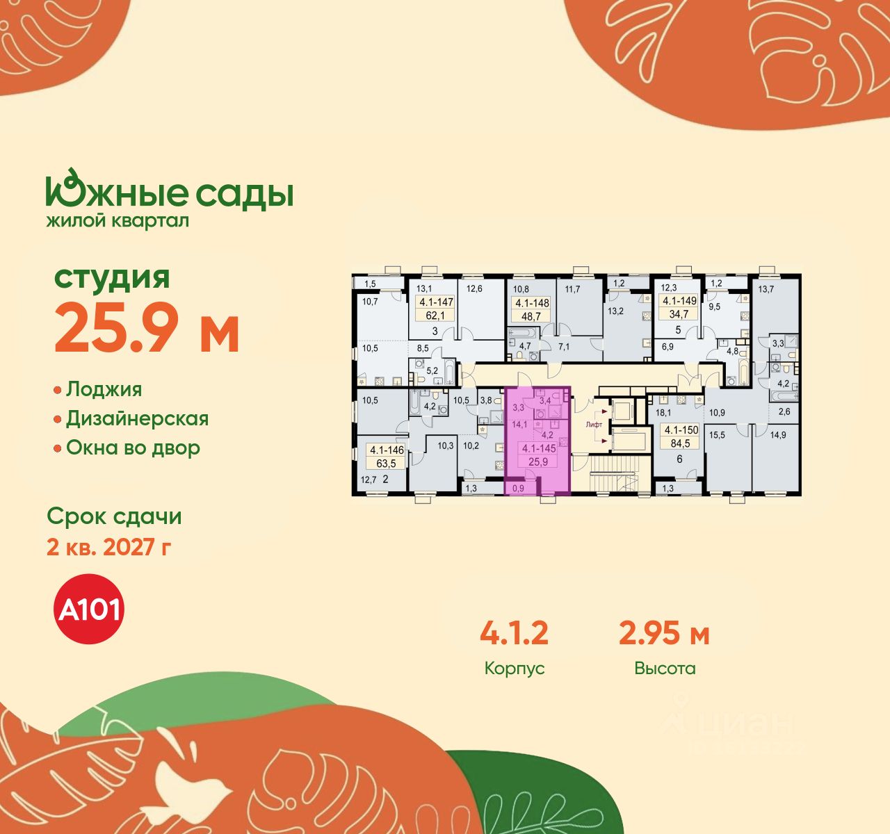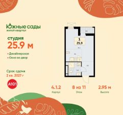 Продается студия  175 в новостройке ЖК "Южные Сады" по адресу Москва, ЮЗАО, Южное Бутово, ул. Бартеневская, д. 16. Общая площадь квартиры - 25.90 кв. м., этаж 8 из 11, секция 2. Тип проекта, по которому построен дом - монолит, компания-застройщик - ООО "А101". Стоимость квартиры - 11768183 Р. Срок сдачи - 2 квартал 2027.