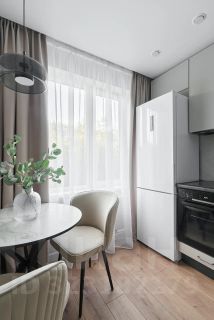 - Светлая кухня (укомплектована современной техникой: посудомойка, варочная панель, духовой шкаф, холодильник)