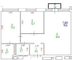 Общая площадь объекта 76.6 кв.м, высота потолков 3,22 м.