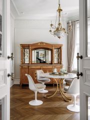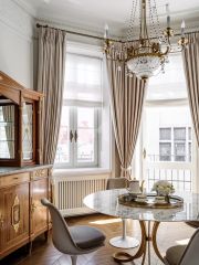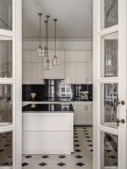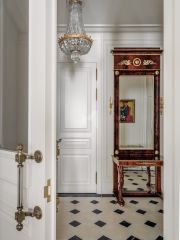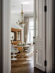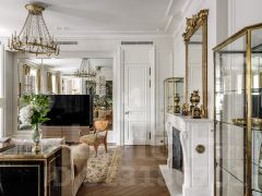 Пространство квартиры представляет собой гармоничный диалог эпох, где каждая деталь тщательно продумана. Высокие потолки 3,8 метра и трехметровые двери создают ощущение простора и торжественности.