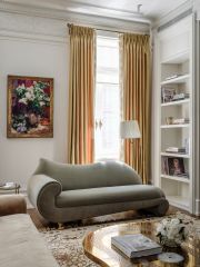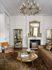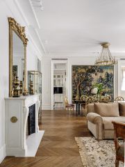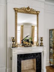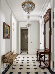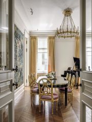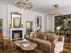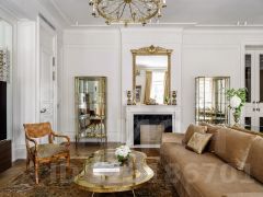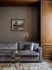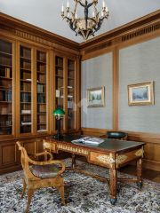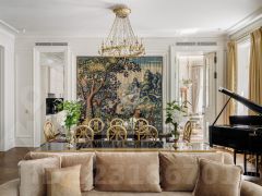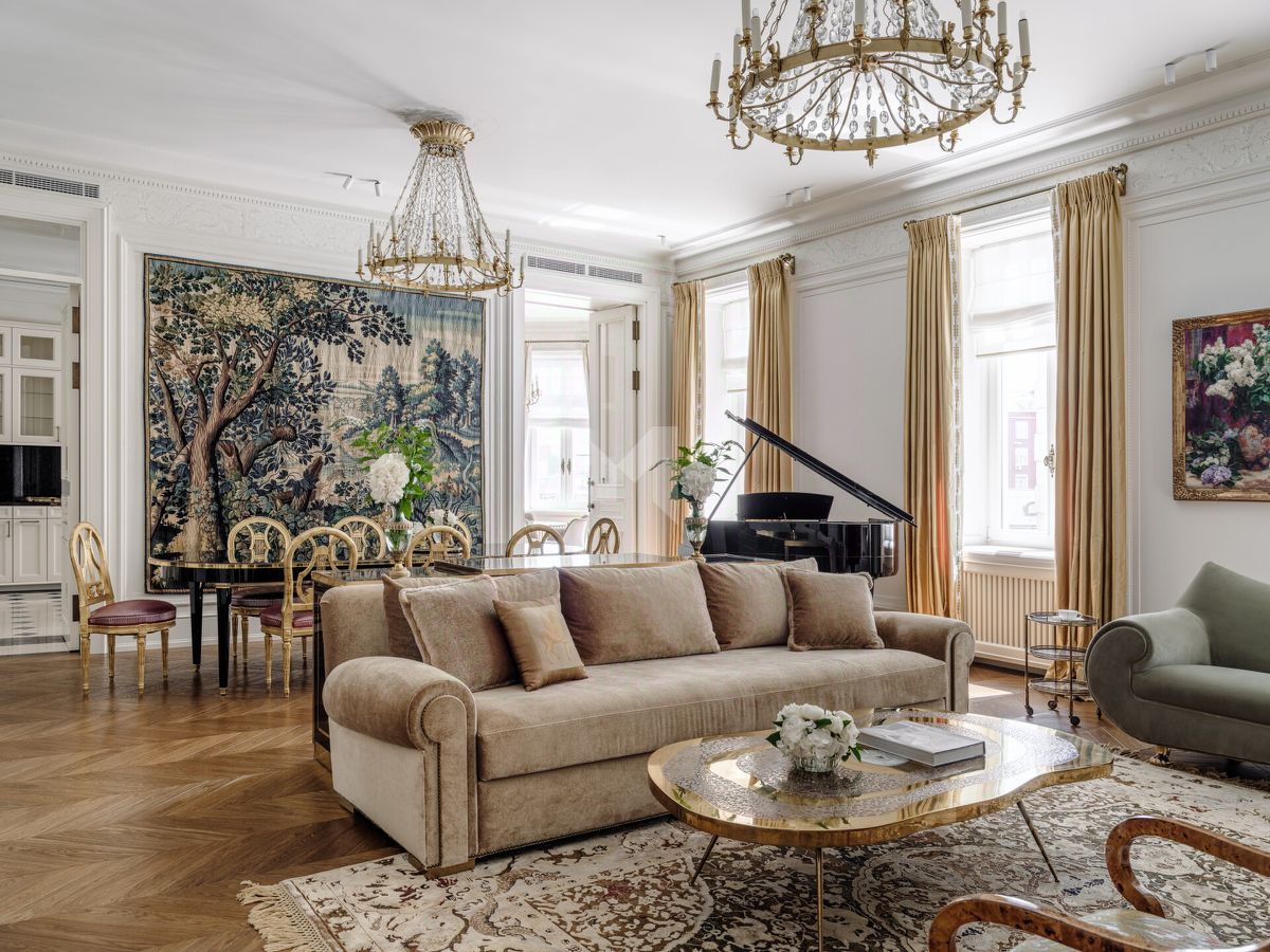 Уникальные элементы отделки включают мрамор в санузлах, панели из красного дерева в кабинете и шелковые обои ручной работы в спальне. Интерьер обогащен подлинными артефактами, такими как гобелен XVIII века и антикварные люстры, которые соседствуют с современной системой приточно-вытяжной вентиляции с климат-контролем.