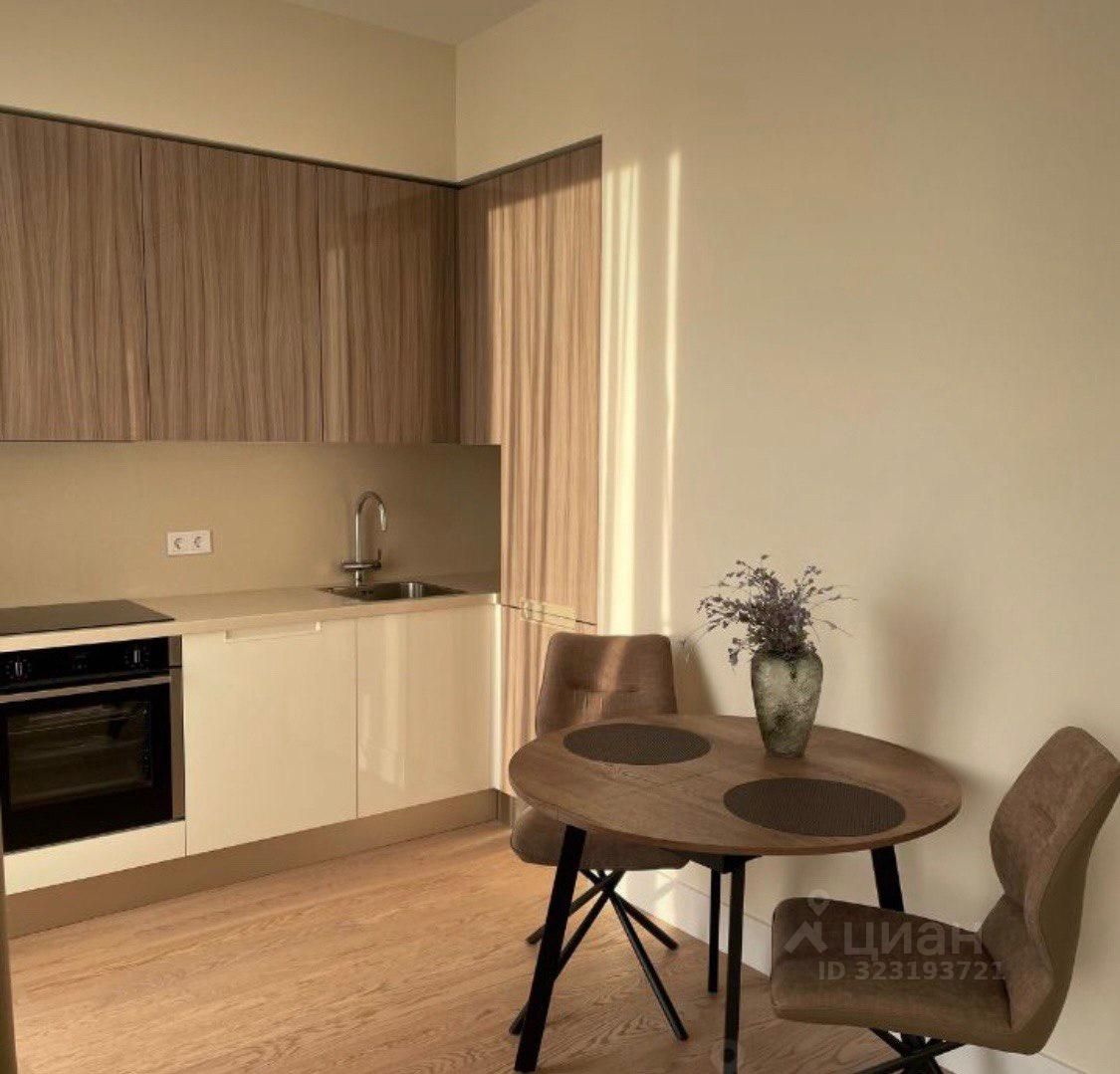 На кухне кухонный гарнитур со встроенной бытовой техникой, обеденная группа.