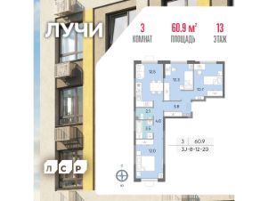 Продается 3-комнатная квартира общей площадью 60.9 кв. метров на 13 этаже жилого комплекса Лучи.