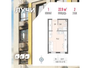 Продается квартира-студия общей площадью 22.9 кв. метров на 2 этаже жилого комплекса Лучи.