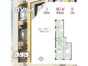 Продается 2-комнатная квартира общей площадью 60.7 кв. метров на 17 этаже жилого комплекса Лучи.