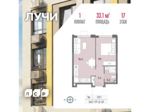 Продается 1-комнатная квартира общей площадью 33.1 кв. метров на 17 этаже жилого комплекса Лучи.