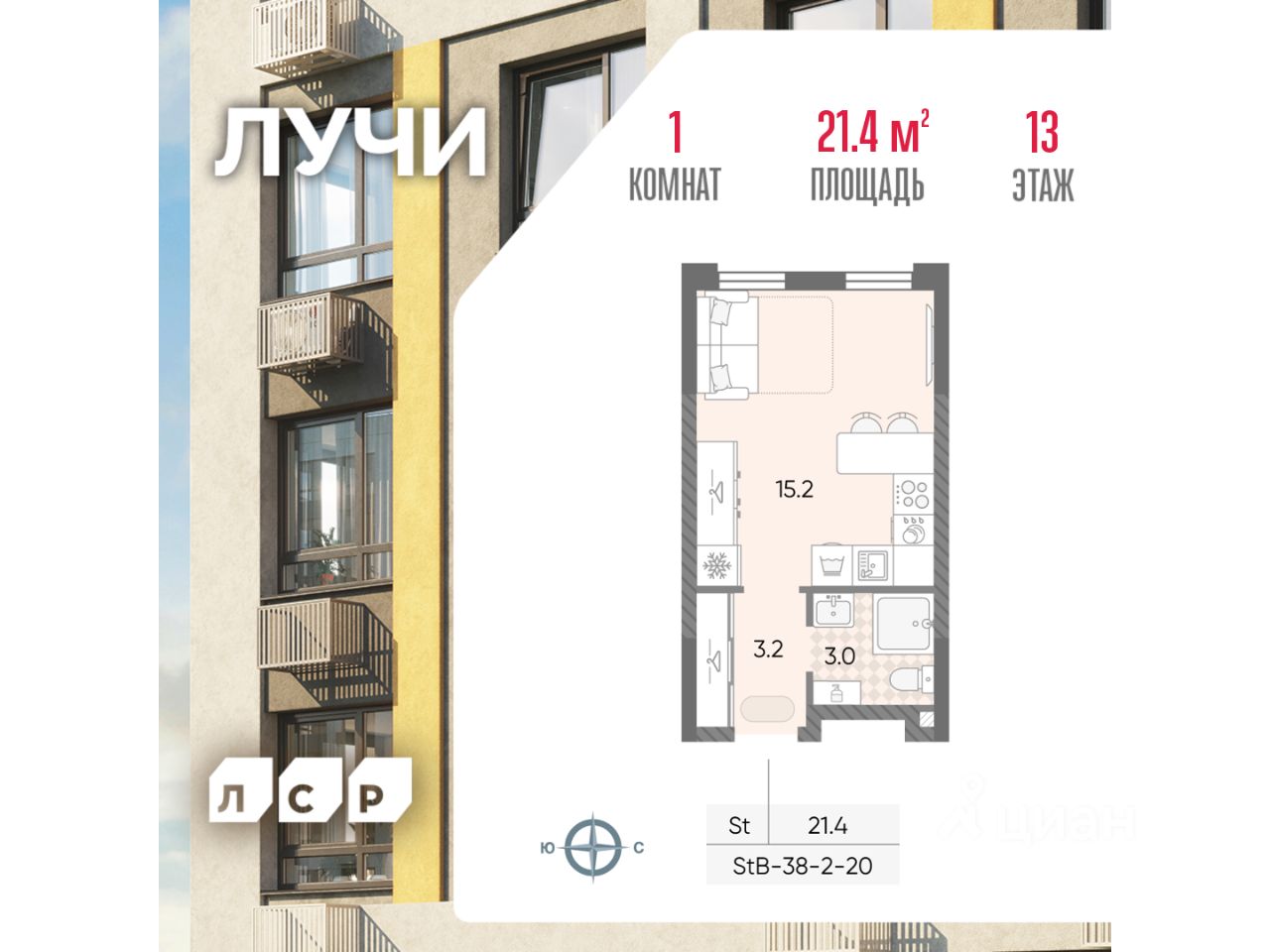 Продается квартира-студия общей площадью 21.4 кв. метров на 13 этаже жилого комплекса Лучи.