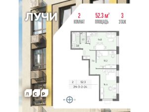 Продается 2-комнатная квартира общей площадью 52.3 кв. метров на 3 этаже жилого комплекса Лучи.