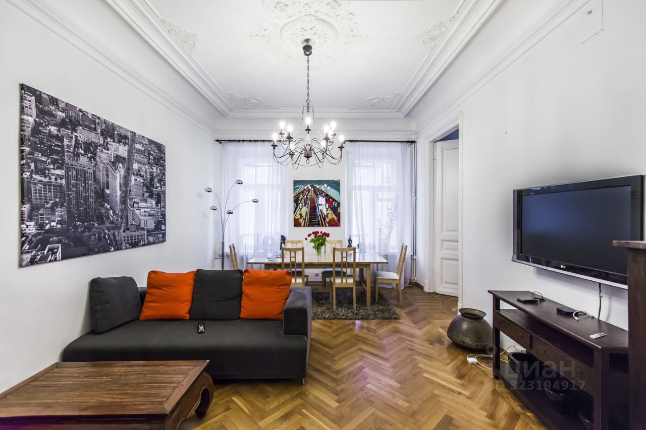 Площадь квартиры - более 130 метров, планировка предусматривает просторную кухню-гостиную, две изолированные спальни, кабинет, гардероб, несколько санузлов. Высота потолков - более 3.6 метров.