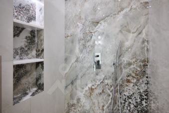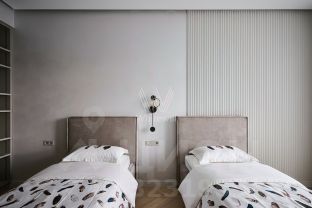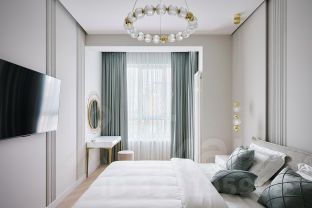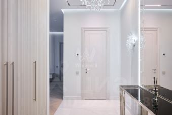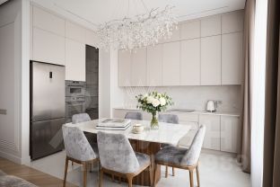 В отделке использованы премиальные материалы: широкоформатный итальянский керамогранит Imola и инженерная доска Coswick. Интерьер оформлен в спокойной современной палитре, дополнен молдингами, акцентными люстрами и светильниками, которые придают пространству характер и лёгкий шарм.