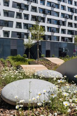 Внутренняя территория ЖК "Рихард" огорожена и полностью изолирована от внешнего окружения. Для малышей здесь устроены игровые площадки с перепадом рельефа. Взрослых романтиков ждут скамейки в тихом ландшафтном парке, уютные лежаки в сенсорном саду и подвесные кресла в колонной галерее. Тем, кому нужно поработать, на свежем воздухе в уютном месте, укрытом от непогоды, оборудована площадка оворкинга с розетками. Для шумных игр и встреч с друзьями мы создали отдельное пространство, которое не потревожит безмятежный внутренний мир жилого комплекса. С внешней стороны дома расположился сквер со спортивными и игровыми площадками для детей разного возраста, где каждый ребенок найдет себе развлечение.