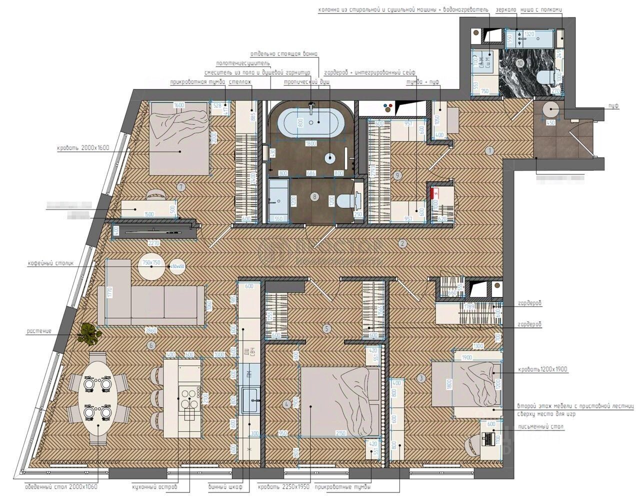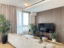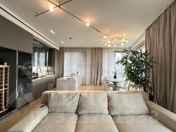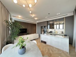 Квартира расположена на 8 этаже современного 34-этажного кирпично-монолитного дома, построенного в 2018 году. Общая площадь квартиры составляет 110,21 кв. м, из которых 36,2 кв. м — жилая площадь. Высота потолков 3,1 м создаёт ощущение простора и свободы.