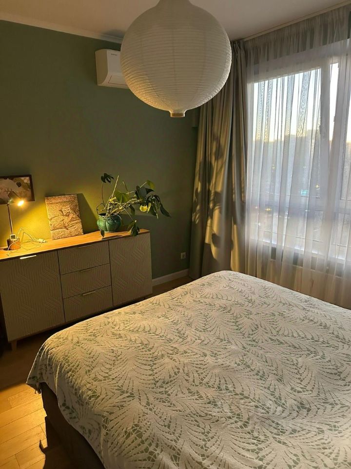 Стены в спальне зеленые, легко засыпается с ощущением, как будто на природе.
