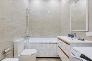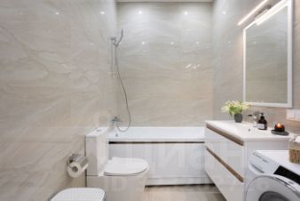 Ванная комната так же оборудована всем необходимым — стиральная машина, зона хранения.