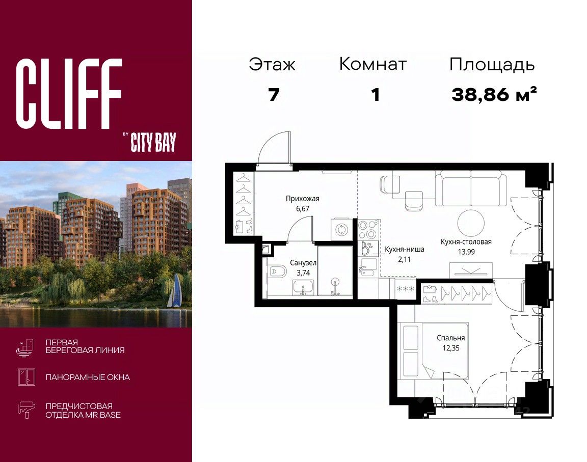 Продаётся 1-комнатная квартира общей площадью 38.86 м² с предчистовой отделкой в ЖК City Вау, квартале Cliff, на 7-м этаже 15 этажного дома.