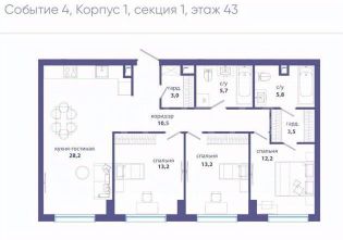 Трехкомнатная видовая квартира расположена на 43 этаже.