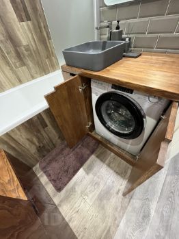 В ванной комнате мебель из массива дерева по индивидуальному проекту с интегрированной стиральной машинкой, установлен масляный полотенцесушитель с регулировкой температуры.
