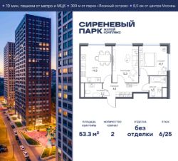 Продаётся просторная 2-комнатная квартира общей площадью 53.3 м² на 6 этаже в новом жилом комплексе "Сиреневый парк", расположенном в Восточном административном округе Москвы на улице Тагильская. Всего 10 минут ходьбы от станции метро "Бульвар Рокоссовского" и одноимённой платформы МЦК.