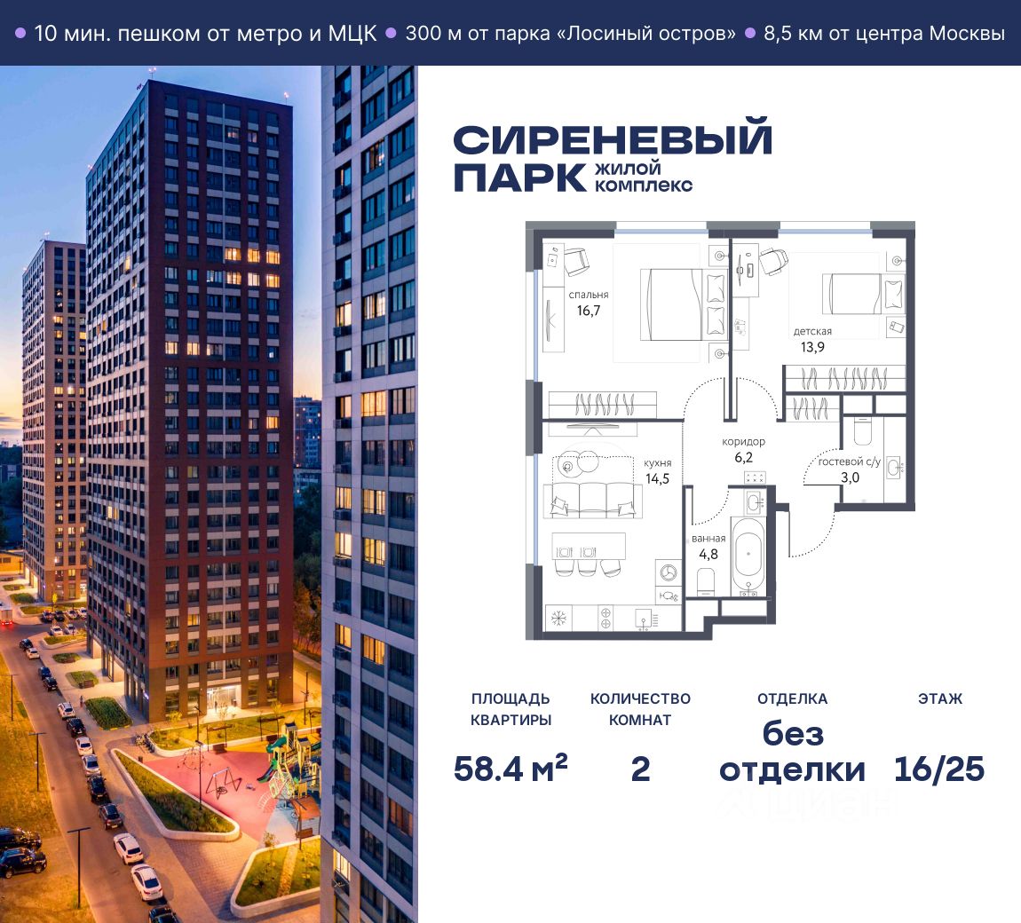 Продаётся просторная 2-комнатная квартира общей площадью 58.4 м² на 16 этаже в новом жилом комплексе "Сиреневый парк", расположенном в Восточном административном округе Москвы на улице Тагильская. Всего 10 минут ходьбы от станции метро "Бульвар Рокоссовского" и одноимённой платформы МЦК.