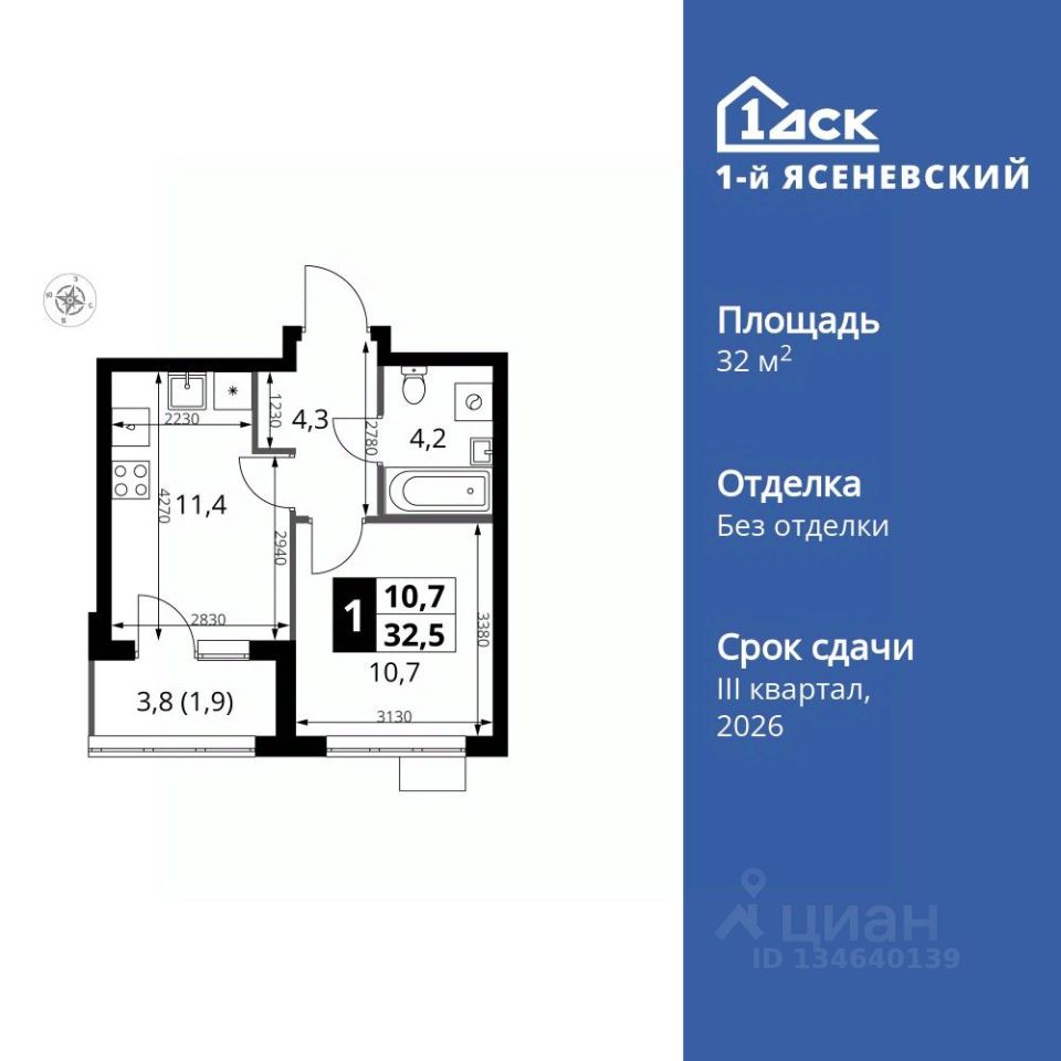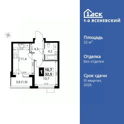 Продаётся 1-к квартира номер 824 общей площадью 32.5 кв.м. на 11-м этаже 16 этажного здания. Без отделки.