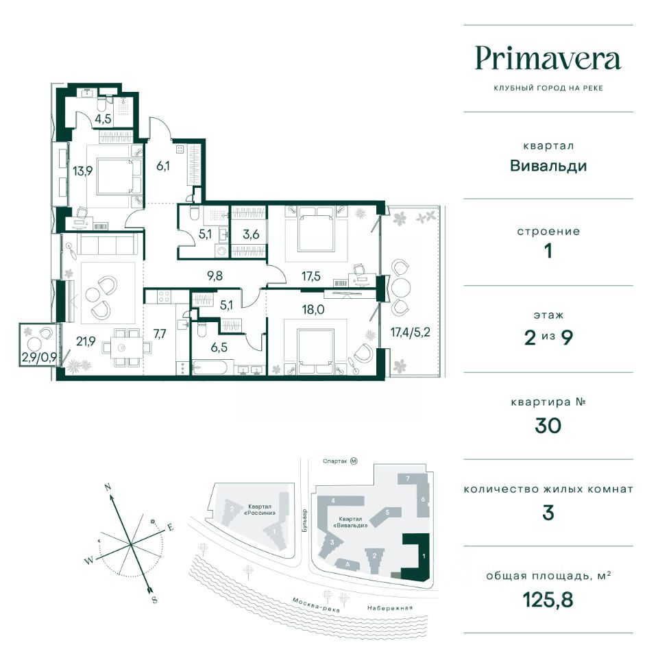 Клубный город на реке Primavera — это современный жилой комплекс премиум-класса, расположенный на первой береговой линии Москвы-реки в экологически чистом районе Покровское-Стрешнево. Под панорамными окнами квартир находится собственный экопарк с продуманной сетью прогулочных дорожек и современными детскими и спортивными площадками. За парком расположена набережная с собственным пляжем и зонами для отдыха. Клубный город на реке Primavera предлагает широкий выбор планировок для различных жизненных сценариев: от просторных однокомнатных квартир до пентхаусов и жилых помещений с террасами и патио. Выберите из 120 вариантов эргономичных планировок стандартного и евроформата. Из каждой квартиры открываются красивые виды на реку с углом обзора в 270 градусов. Дизайнерские лобби предлагают панорамный обзор на благоустроенный двор. Высокие потолки в 6 метров и качественная отделка создают атмосферу, схожую с пятизвездочными отелями. В Primavera есть всё необходимое для комфортной жизни в мегаполисе: • Образование для детей в шаговой доступности: 4 школы, 8 детских садов и развивающие центры с кружками и секциями. • Удобства на расстоянии приятной прогулки: супермаркеты, кафе, рестораны с верандами, салоны красоты, аптеки и многофункциональный центр для шоппинга и развлечений. • Умный дом: автоматизированное бесконтактное управление основными системами доступа и безопасности через мобильное приложение. Клубный город на реке Primavera выгодно сочетает комфорт городской жизни с близостью к природе. Живите в месте, где все создано для вашего удобства!