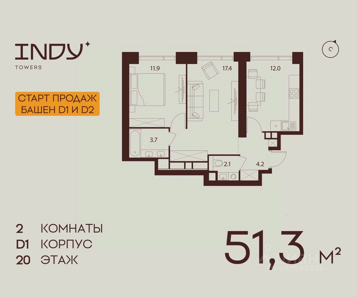 Продается 2-комнатная квартира на 20 этаже жилого комплекса Indy Towers. Срок сдачи: 3 кв. 2029 г.
