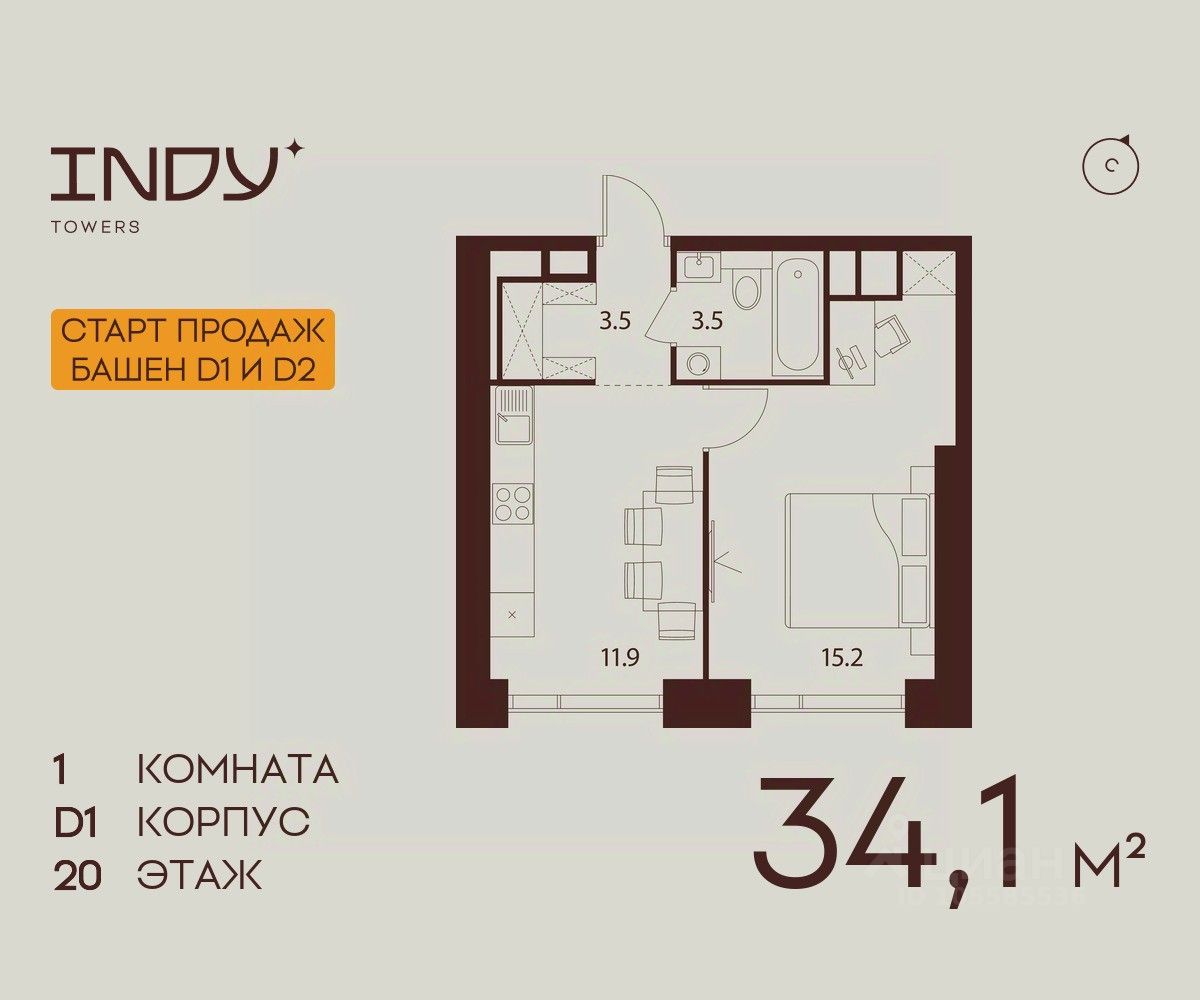 Продается уютная однокомнатная квартира на 20 этаже жилого комплекса Indy Towers. Срок сдачи: 3 кв. 2029 г.