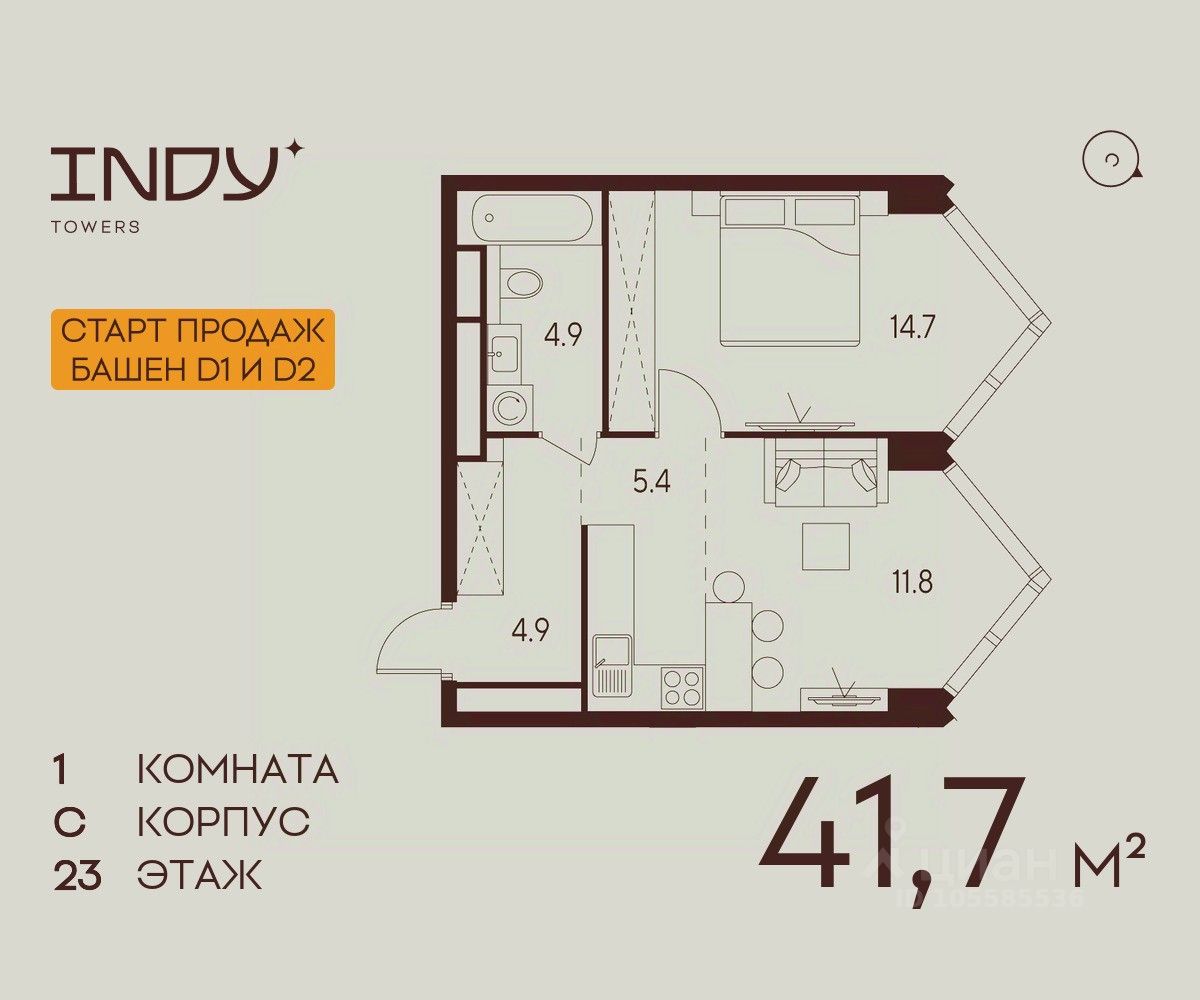 Продается уютная однокомнатная квартира на 23 этаже жилого комплекса Indy Towers. Вид из окон: на улицу. Срок сдачи: 4 кв. 2026 г.