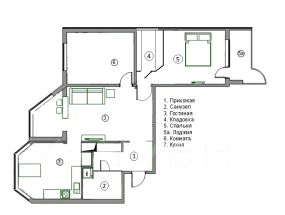 Большая кухня: 13,2 кв/м; Гостиная: 23,3 кв/м; Две изолированных спальни: 14,8 и 14,2 кв/м; Гардеробная: 4 кв/м; Лоджия: 4,1кв/м; Прихожая: 5.5кв/м; Санузел: 6 кв/м.