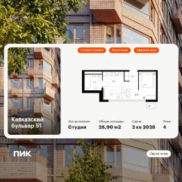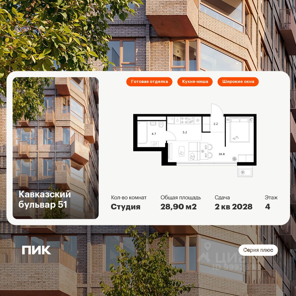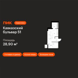 Продаётся квартира-студия площадью 28,9 кв.м на 4 этаже 23 этажного дома (Корпус 3.1, Секция 1) проекта ПИК Кавказский бульвар 51. Светлый просторный подъезд на уровне земли, функциональная планировка, большие окна, c отделкой.