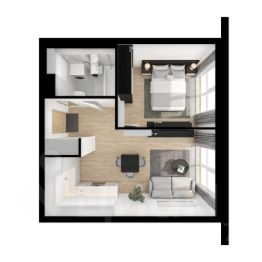 В корпусе 1.4 появится общественная терраса на 30-м этаже. Доступ сюда есть только у жителей, поэтому вы не встретите в этом пространстве посторонних людей. Здесь можно заниматься спортом, отдохнуть за чтением книги или создать собственный сад. А ещё отсюда открываются красивые виды на город.