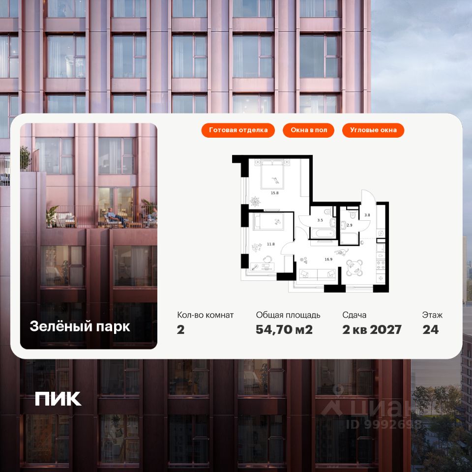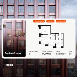 Продаётся 2-комн. квартира площадью 54,7 кв.м на 24 этаже 28 этажного дома (Корпус 6.6, Секция 5) проекта ПИК Зелёный парк. Светлый просторный подъезд на уровне земли, функциональная планировка, большие окна, c отделкой.