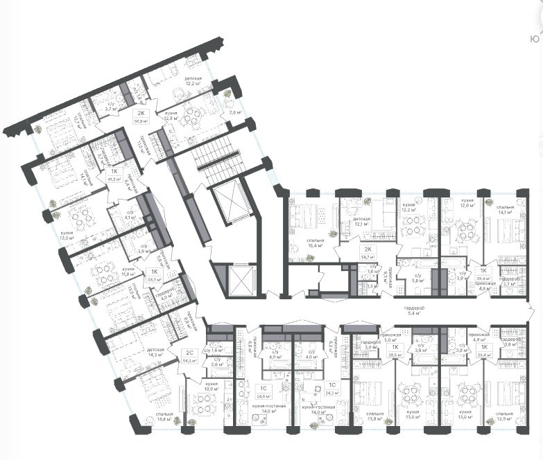 Среди планировочных решений представлены разнообразные форматы: от функциональных студий до просторных 4-комнатных квартир и апартаментов площадью от 22 до 105 м². Высокие потолки усиливают ощущение простора, а продуманные планировки включают мастер-спальни, гардеробные, угловые окна, объединённые кухни-гостиные и несколько санузлов.
