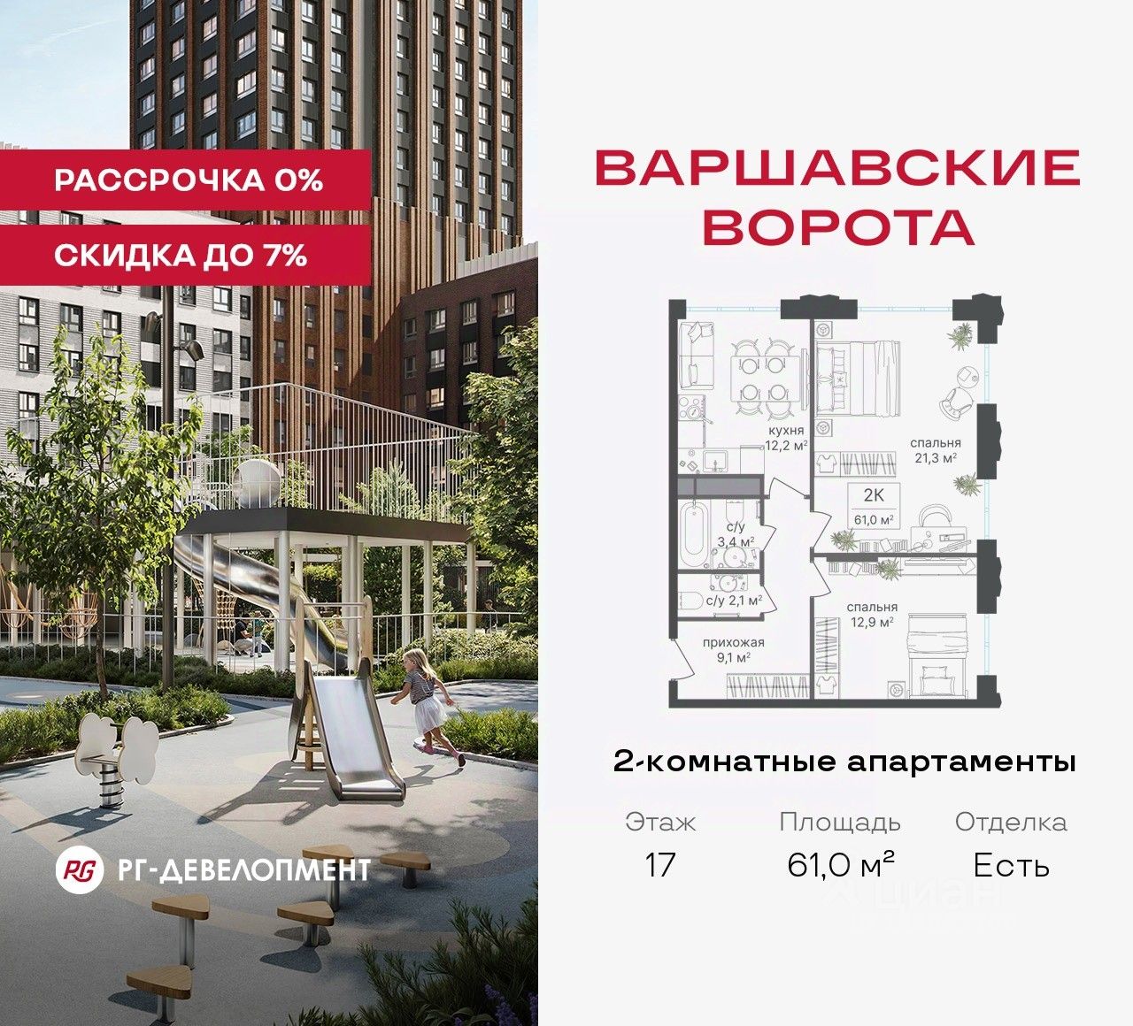 Рассрочка 0% + скидка 5%. Первый платёж 50% при ДДУ, второй 50% — через 12 мес. до ввода ЖК.