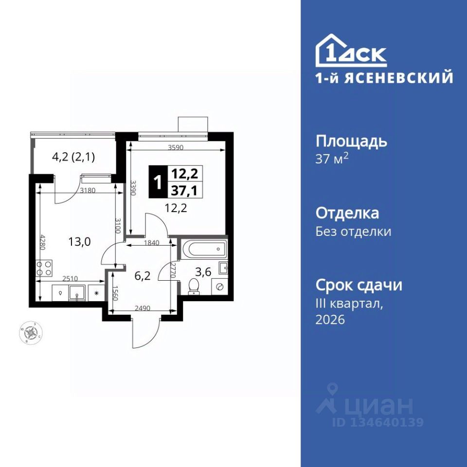 Продаётся 1-к квартира номер 570 общей площадью 37.1 кв.м. на 16-м этаже 18 этажного здания. Без отделки.