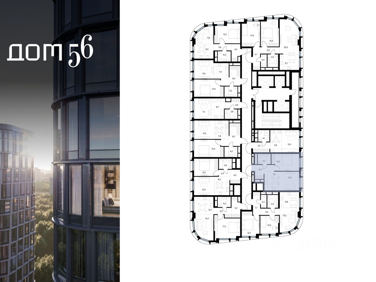 В премиум-квартале "Дом 56" на Бауманской напрямую от девелопера ГК "Галс-Девелопмент" представлена 1-комнатная квартира на 26 этаже общей площадью 45.20 м².