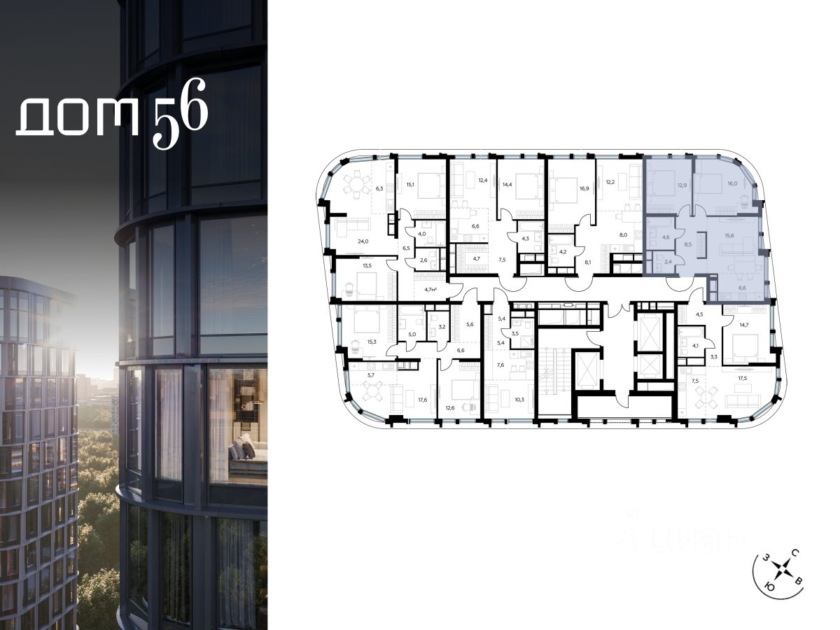 Архитектурный стиль "Дома 56" - параметрический минимализм. Футуристические фасады квартала с "эффектом закручивания" словно вращаются вокруг своей оси. Динамичный образ башен дополняет эффектное остекление - окна в пол будут в каждой квартире.