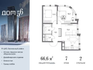 В премиум-квартале "Дом 56" на Бауманской напрямую от девелопера ГК "Галс-Девелопмент" представлена 2-комнатная квартира на 7 этаже общей площадью 66.60 м².