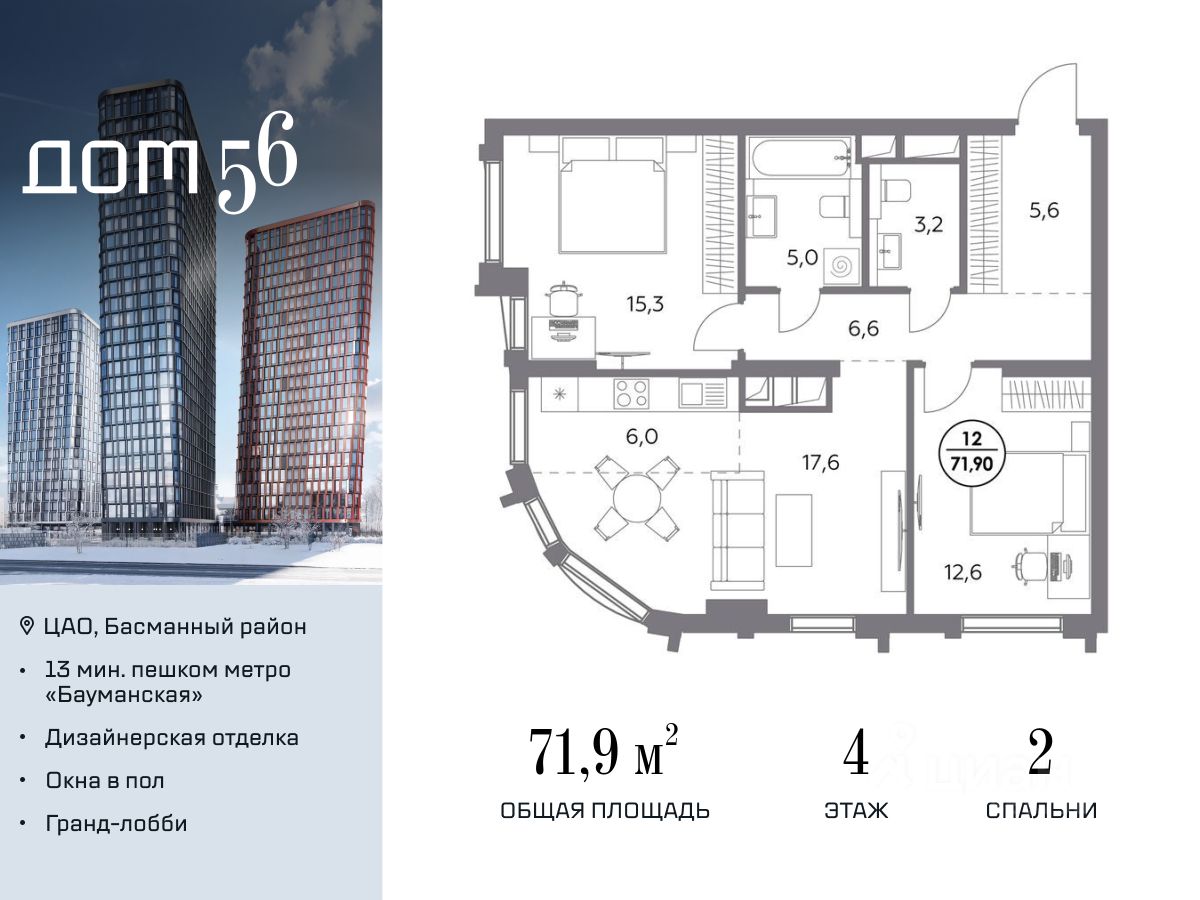 В премиум-квартале "Дом 56" на Бауманской напрямую от девелопера ГК "Галс-Девелопмент" представлена 2-комнатная квартира на 4 этаже общей площадью 71.90 м².