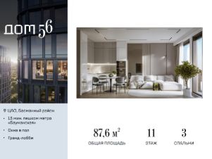 В премиум-квартале "Дом 56" на Бауманской напрямую от девелопера ГК "Галс-Девелопмент" представлена 3-комнатная квартира на 11 этаже общей площадью 87.60 м².