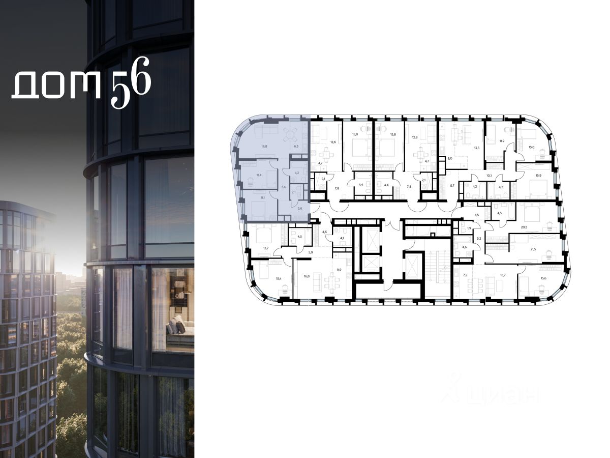 Архитектурный стиль "Дома 56" - параметрический минимализм. Футуристические фасады квартала с "эффектом закручивания" словно вращаются вокруг своей оси. Динамичный образ башен дополняет эффектное остекление - окна в пол будут в каждой квартире.