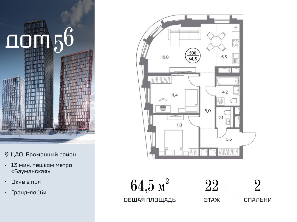 В премиум-квартале "Дом 56" на Бауманской напрямую от девелопера ГК "Галс-Девелопмент" представлена 2-комнатная квартира на 22 этаже общей площадью 64.50 м².