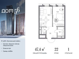 В премиум-квартале "Дом 56" на Бауманской напрямую от девелопера ГК "Галс-Девелопмент" представлена 1-комнатная квартира на 22 этаже общей площадью 47.40 м².