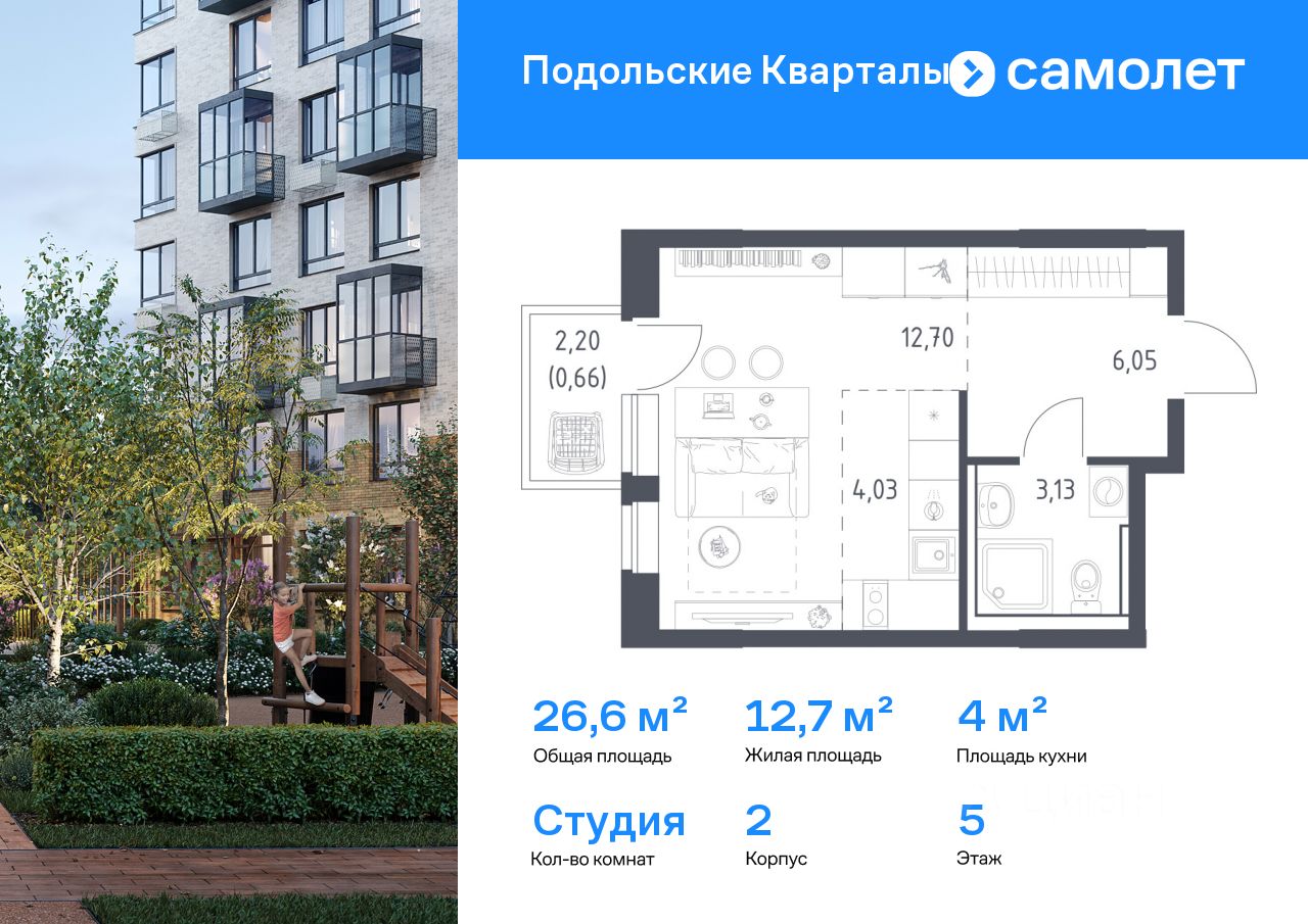 Строим кварталы для жизни с заботой о будущем. Предлагается квартира студия комфорт-класса 26,57 кв.м в корпусе 2 на 5 этаже, в ЖК "Подольские Кварталы"